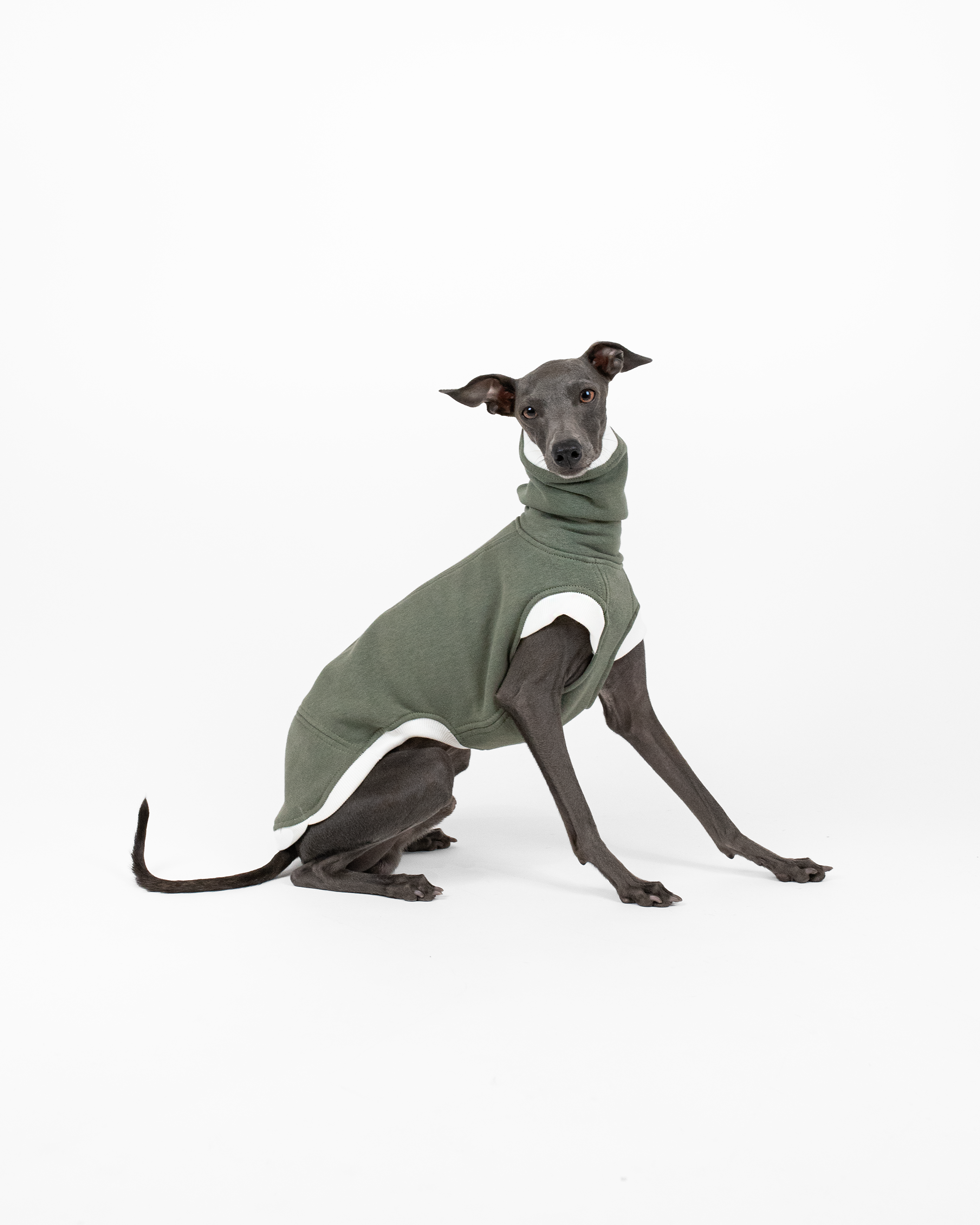 Handmade & high-quality Army Green Cozy Waistcoat is tailored without sleeves and mainly designed for Italian Greyhounds and Whippets. Its curves and lines perfectly meet the needs of our beloved fast runners. The fabric is thick and has warm fluff on the inner side. This feature keeps Your dog warm during chilly weather, whether its windy, cloudy or both.
