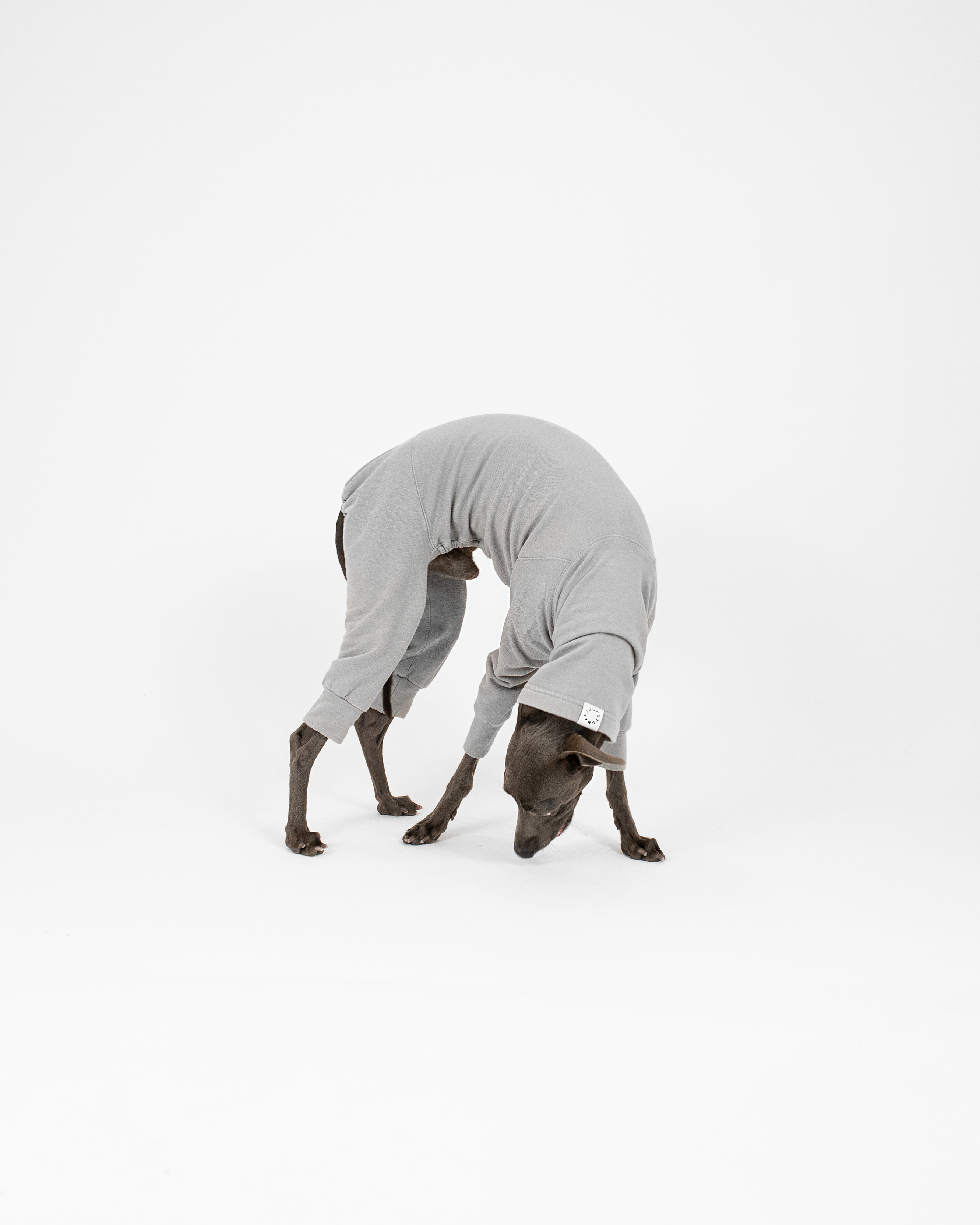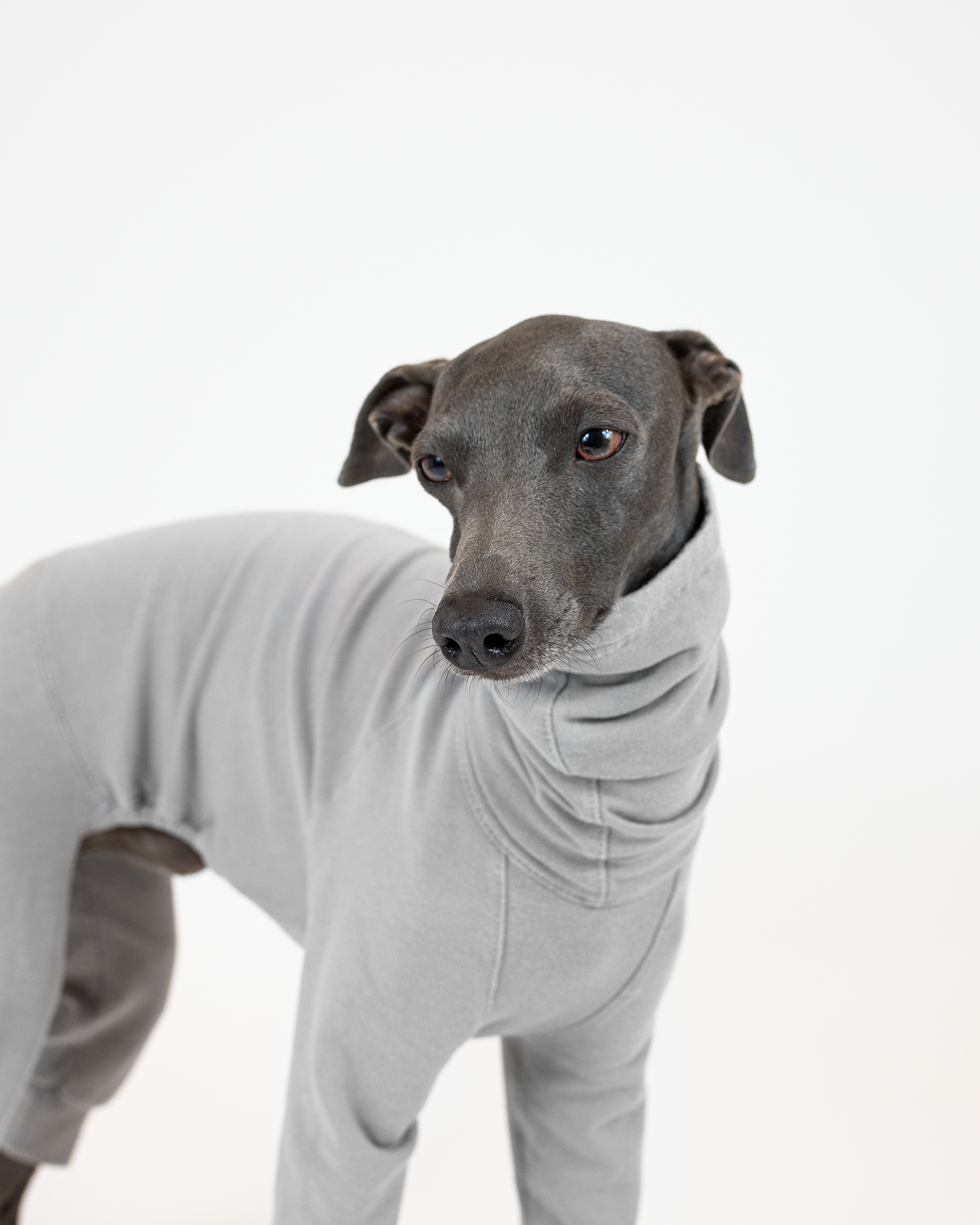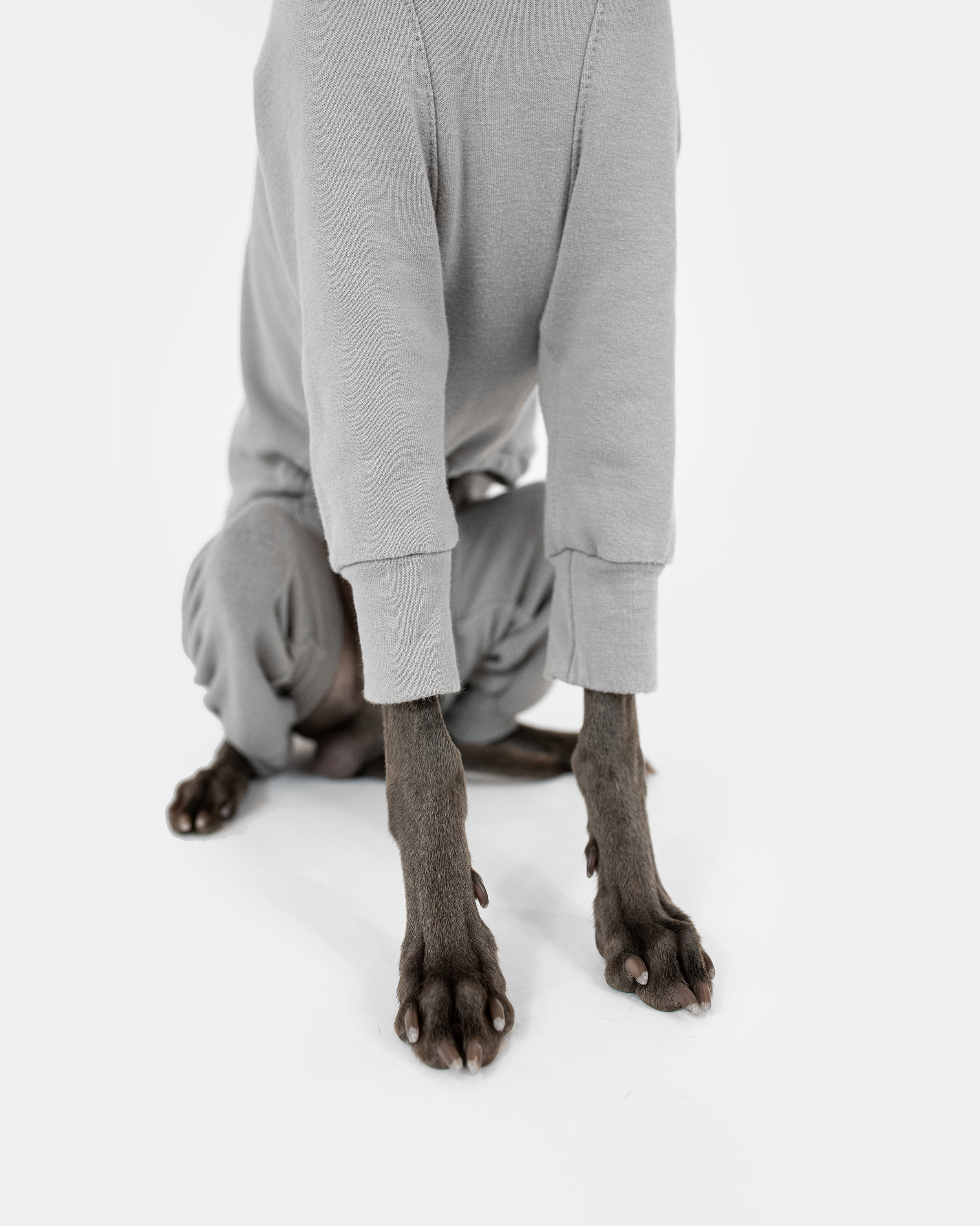 Handmade & high-quality slim fit Light Grey Regular Jumpsuit especially designed for Italian Greyhounds. Its curves and lines perfectly meet the needs of our beloved fast runners. The fabric is stretchy and light, but at the same time – warming. Because of the soft fluff on the inner fabric side, the clothing becomes even more cozy. This feature helps to keep Your dog warm during chilly weather. Thin and stretchy fabric allows the garment to fit the dog’s body perfectly and creates a fit-like-a-glove effect. Moreover, this Snug Jumper has a long turtleneck part! What a good way to maintain warmth on windy days.