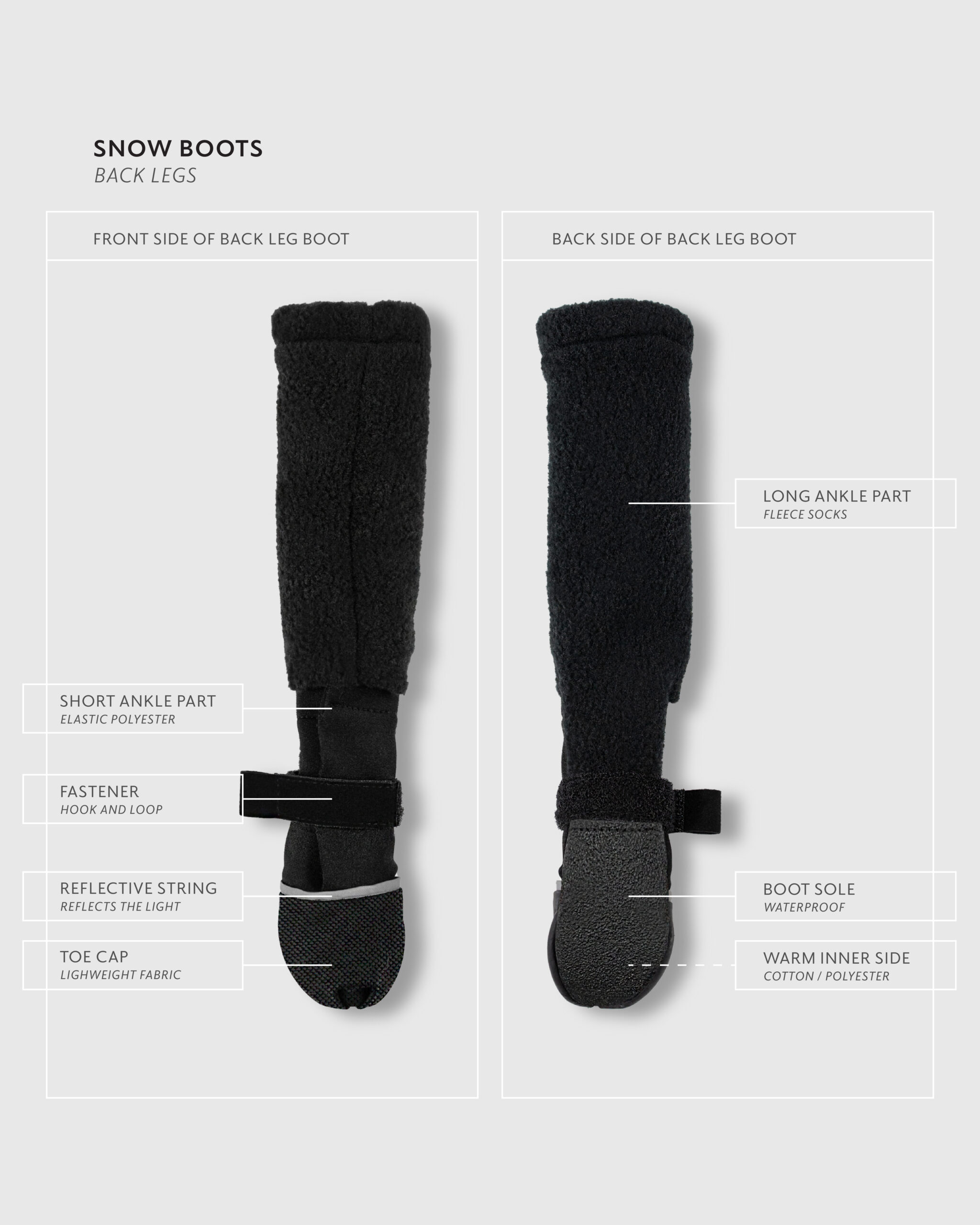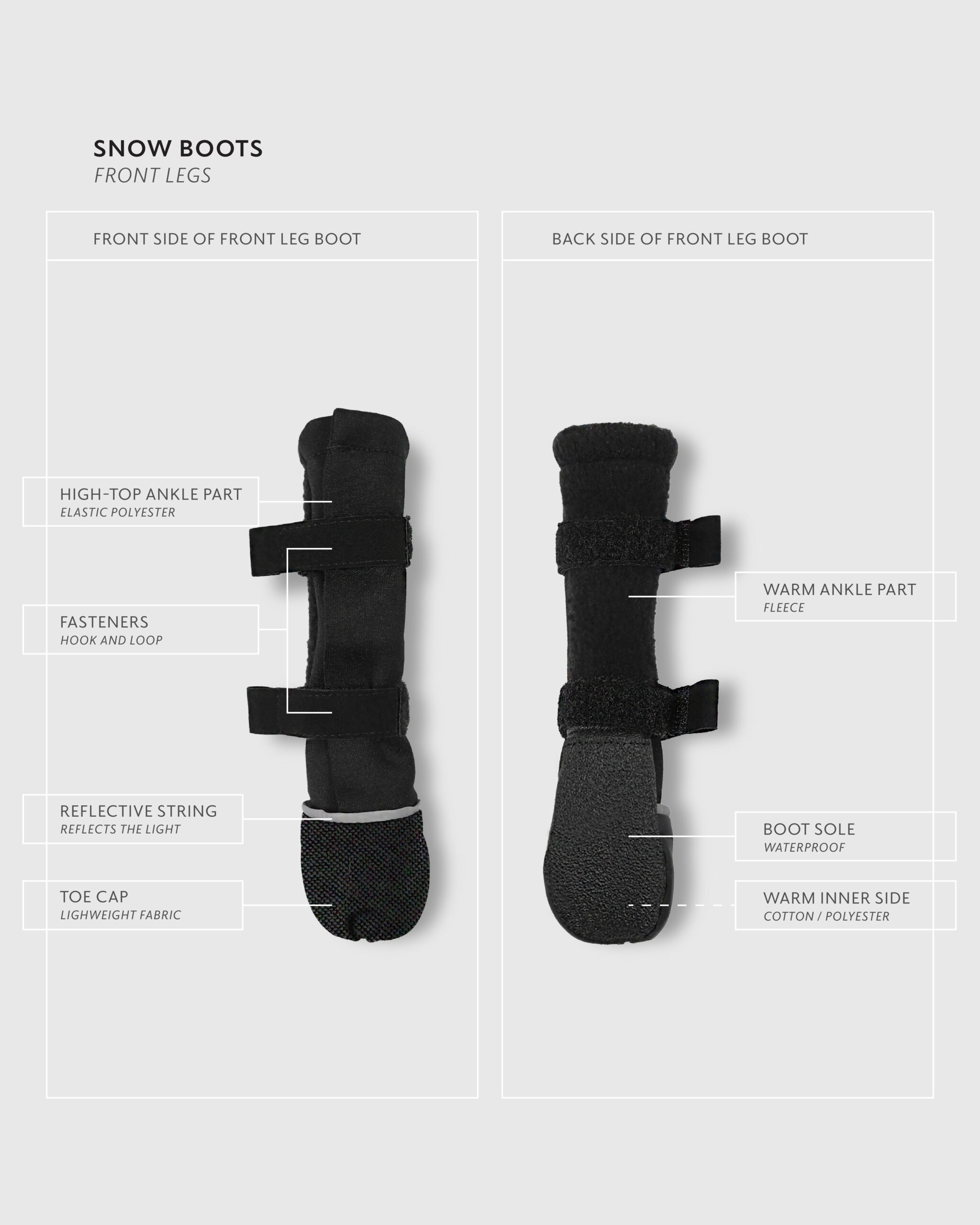 For flexibility and support, the front (high-top) boots include elastic polyester around the ankle. Meanwhile, the back boots feature long, warm fleece “sock” sections made from polyester. Finally, reflective strings decorate the front of each boot to improve visibility in low light.