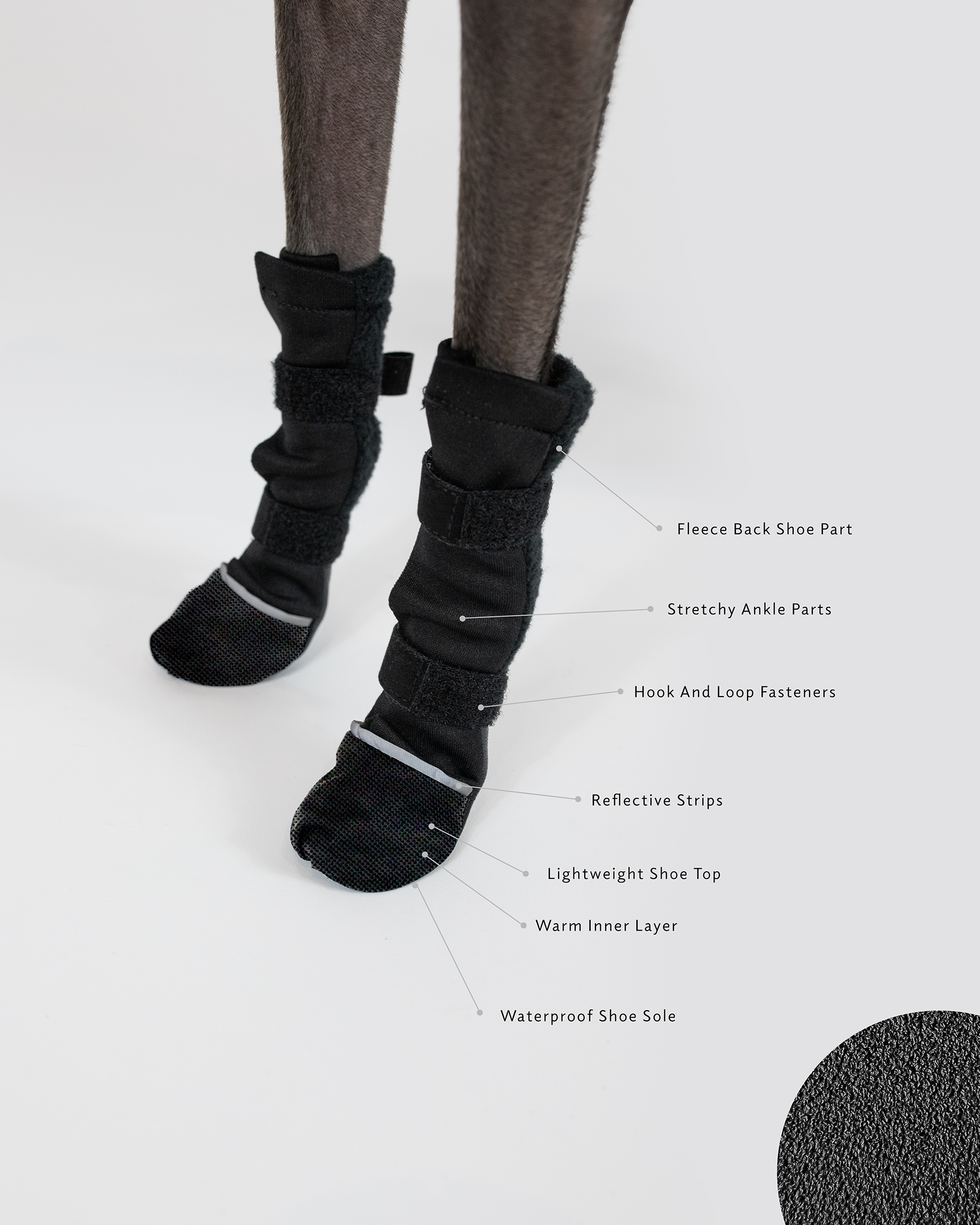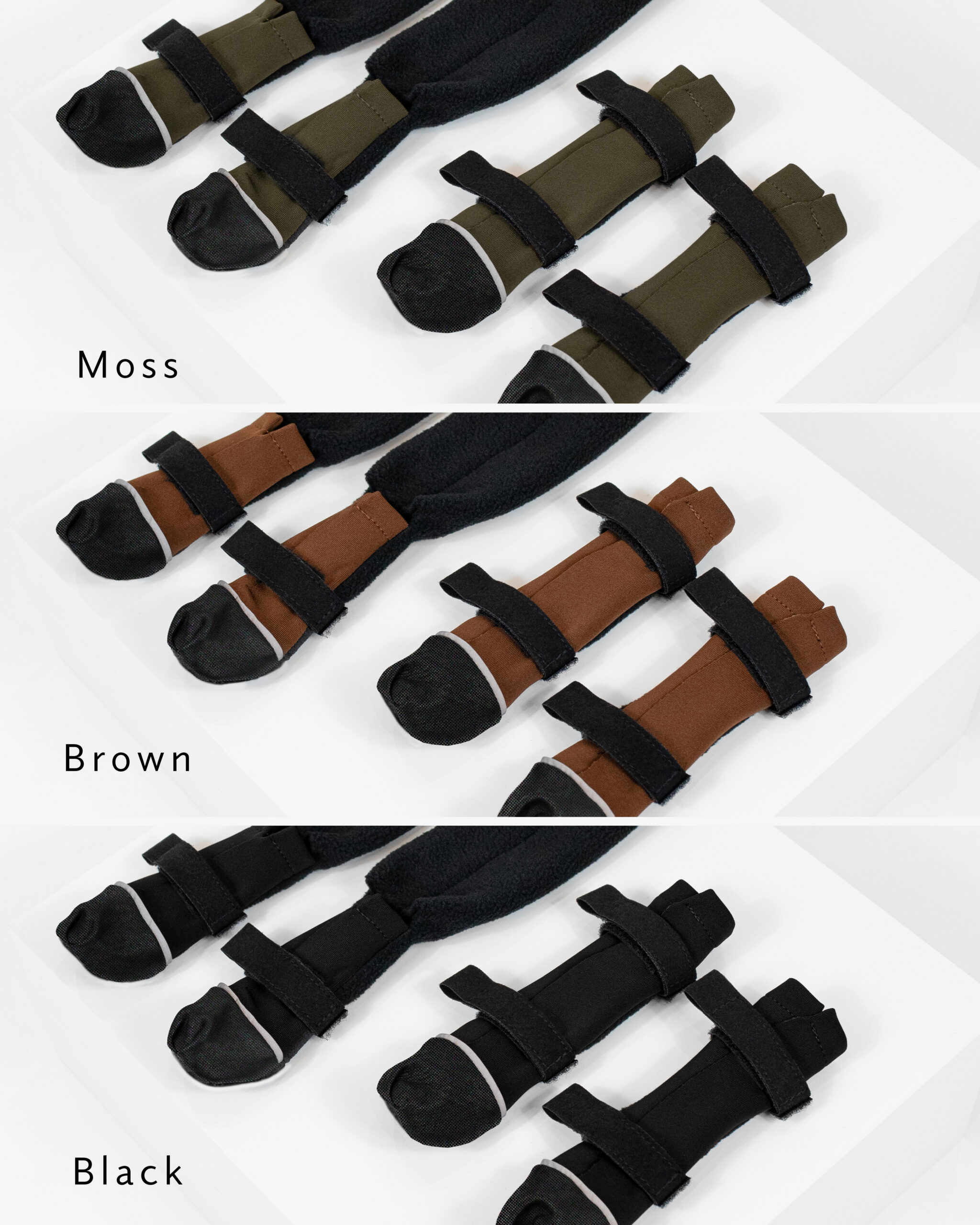 To keep the boots securely in place, we use hook-and-loop fasteners. Front boots feature two fasteners, while back boots use one. This design choice is intentional. A dog’s back leg has a tendon that runs low along the leg. Because of this, fasteners must never sit on tendons. This detail is critical. Boots that attach over tendons can harm your dog. Therefore, we prioritize canine welfare just as much as warmth and protection.