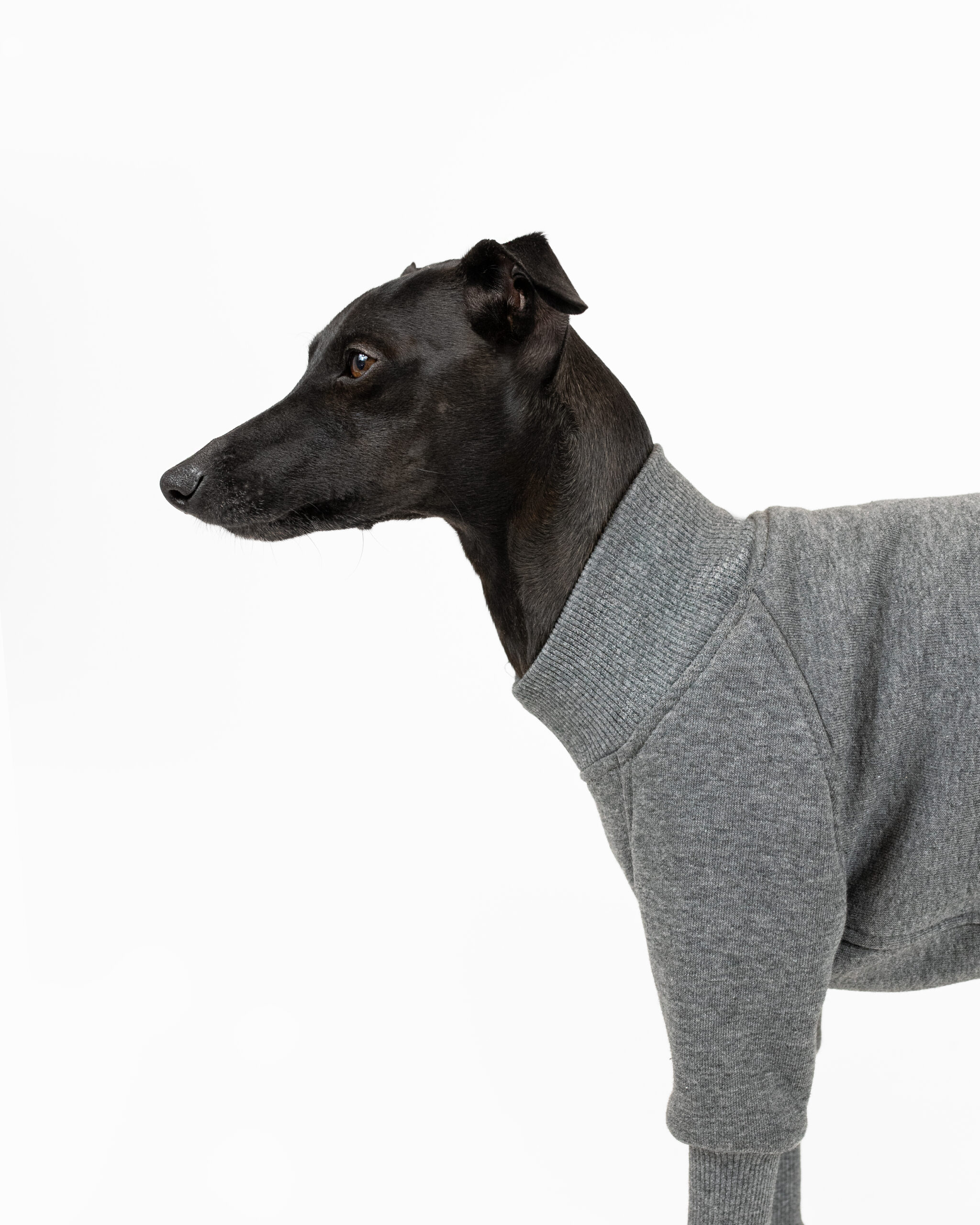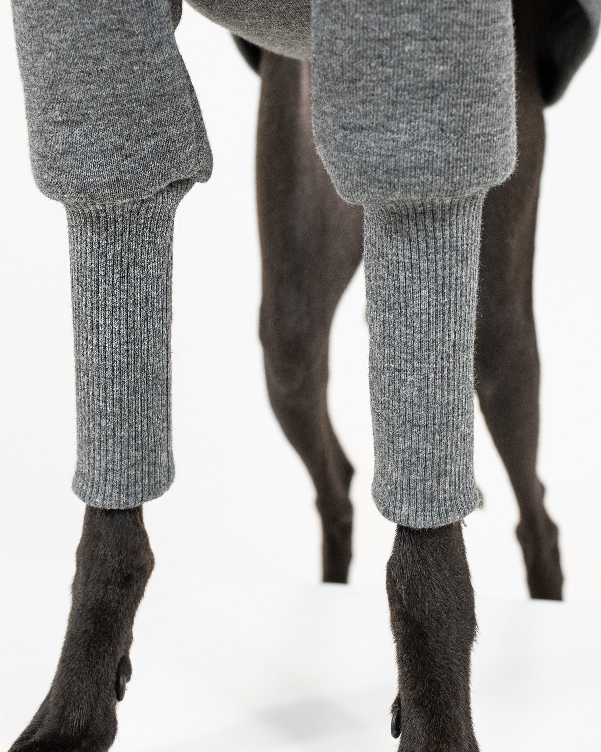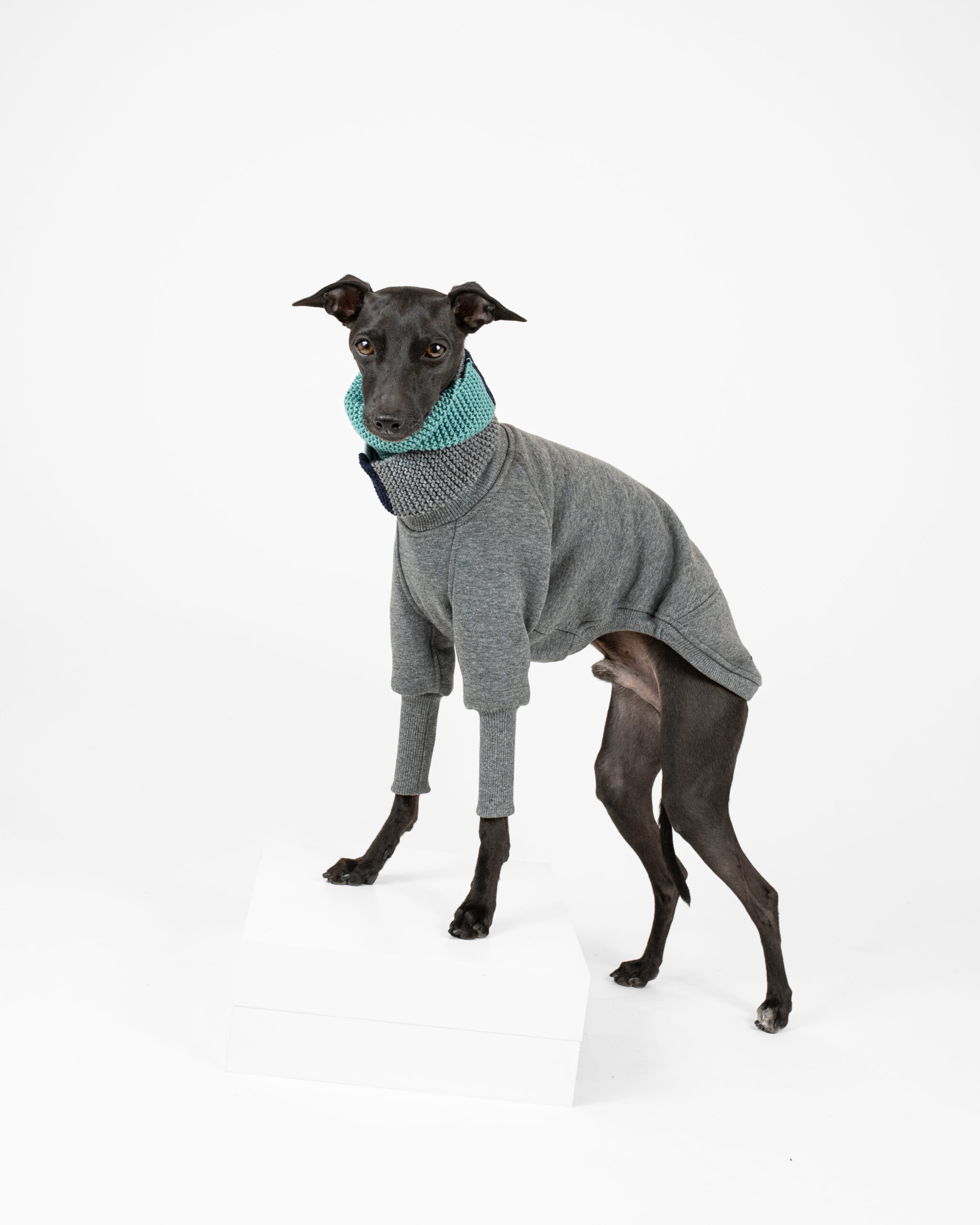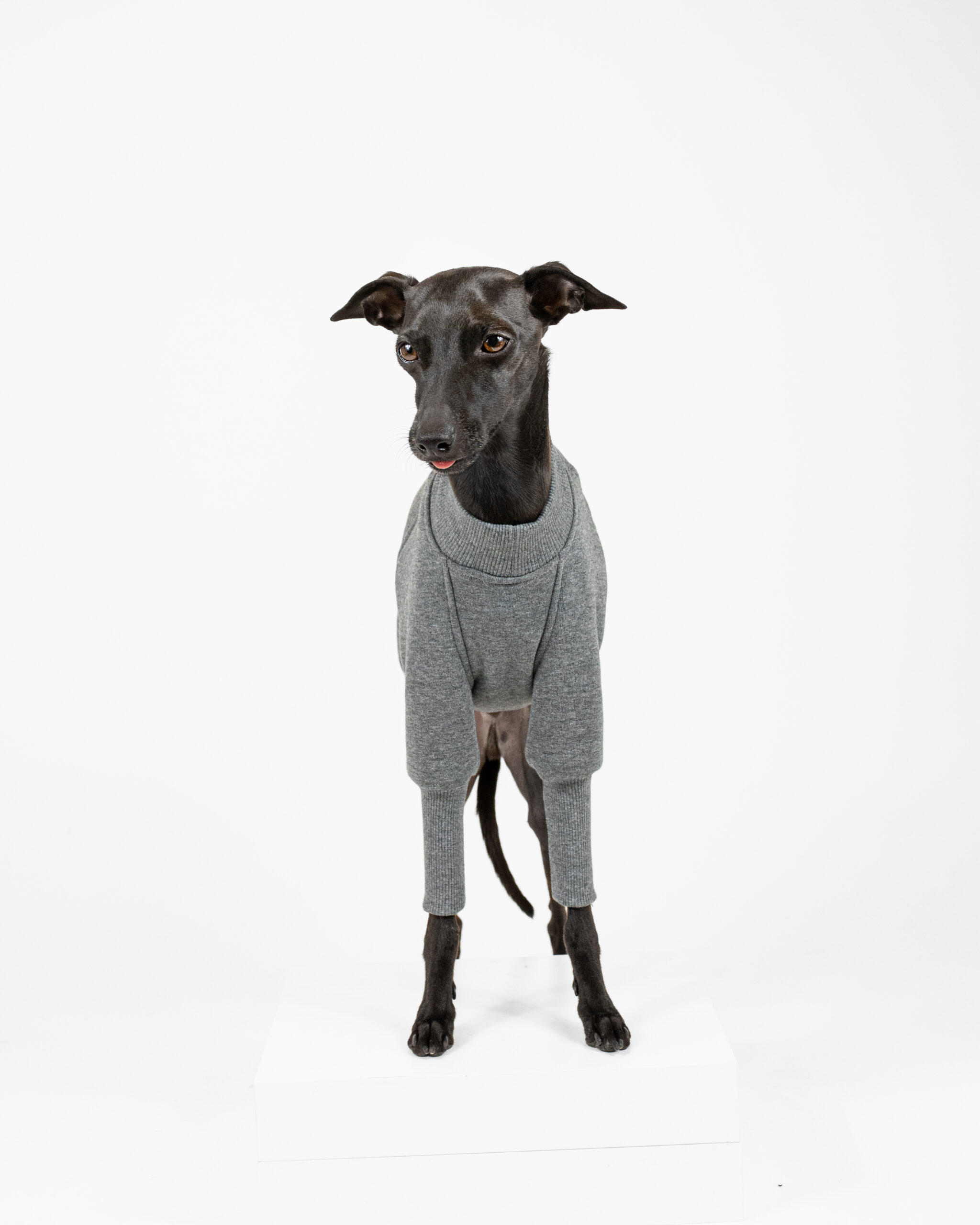 The Soft Core Jumper meets parameters such as appropriate length, no issue in dressing up the dog. The blazer also has some other small and cute details such as slim fit sleeves. The sleeves emphasizes the elegance of greyhound’s legs. The back part of the clothing covers all the body nicely from neck to tail. Most importantly – that does not restrict movements when playing, running or walking. The neck area is tailored short in heigh, so You can simply combine a collar or any other accessorie on top. The blazer can be worn during all seasons – combined with other clothing or simply by itself.